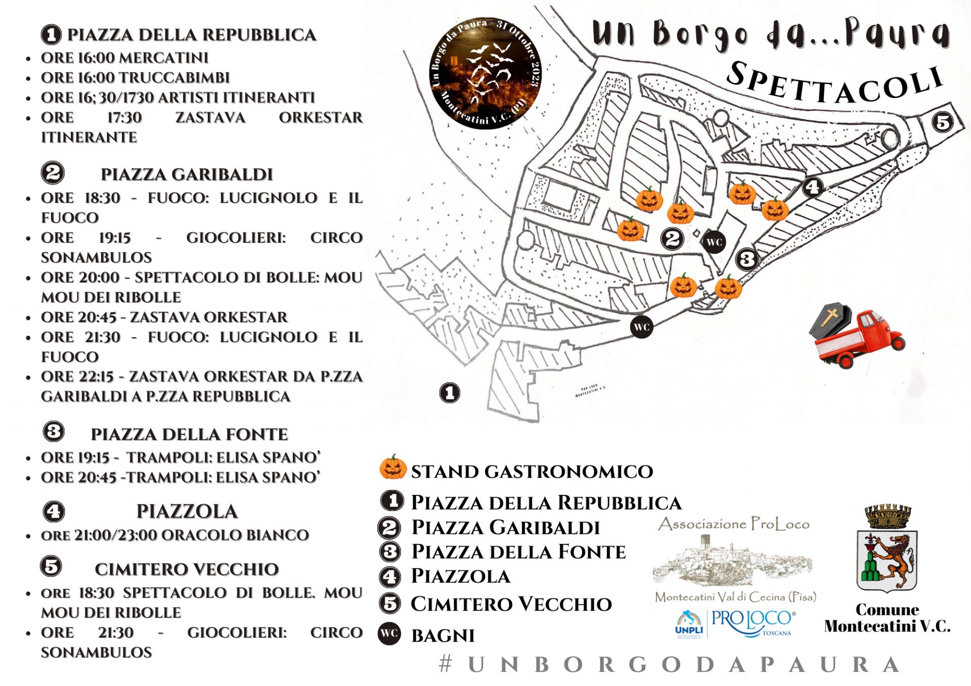 Nella suggestiva cornice del borgo storico del Comune di Montecatini Val di Cecina , prenderanno vita spettacoli con artisti di strada che coinvolgeranno il pubblico, con street band artisti itineranti, spettacolo di fuoco, trampolieri, creando atmosfere da brividi, conducendovi alla scoperta del nostro piccolo borgo!