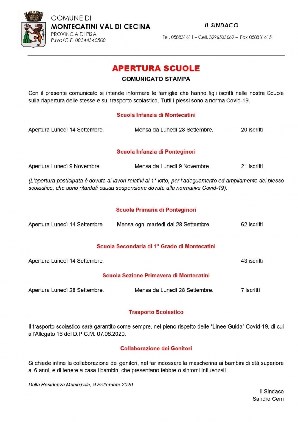 Con il presente comunicato si intende informare le famiglie che hanno figli iscritti nelle nostre Scuole sulla riapertura delle stesse e sul trasposto scolastico. Tutti i plessi sono a norma Covid-19