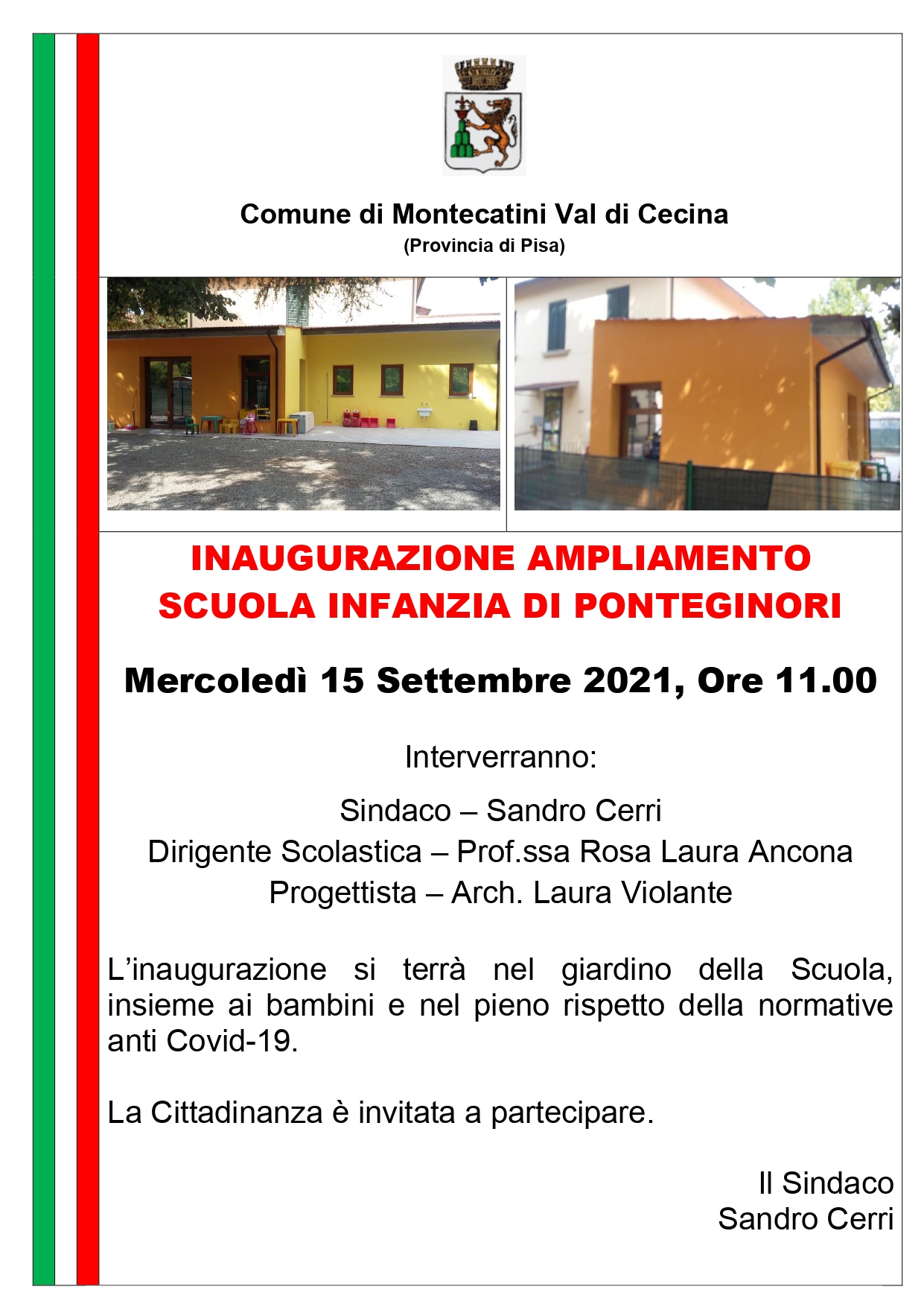 L’inaugurazione si terrà nel giardino della Scuola, insieme ai bambini e nel pieno rispetto della normative anti Covid-19.