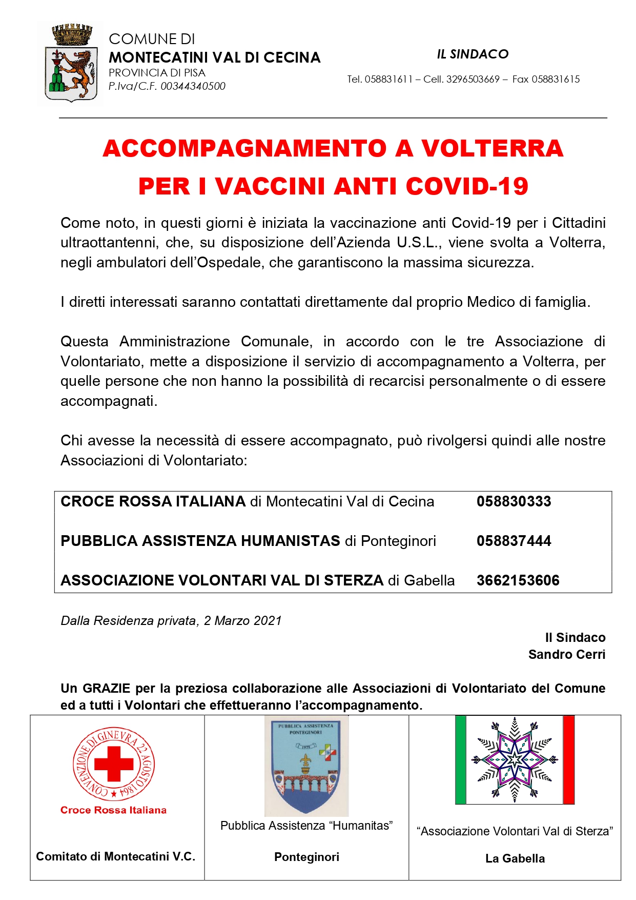 Questa Amministrazione Comunale, in accordo con le tre Associazione di Volontariato, mette a disposizione il servizio di accompagnamento a Volterra, per quelle persone che non hanno la possibilità di recarcisi personalmente o di essere accompagnati.