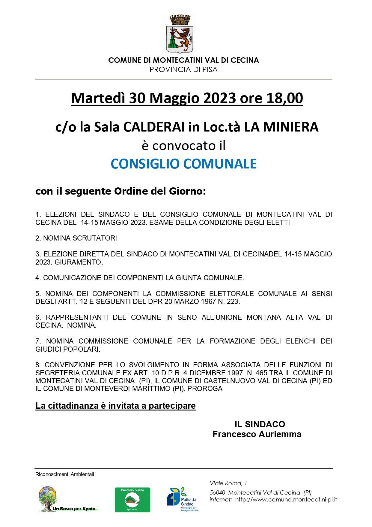 Il giorno 30 maggio p.V. è convocato in sessione straordinaria, in presenza presso La Sala Calderai alle ore 18,00 il Consiglio Comunale con il seguente ordine del giorno: